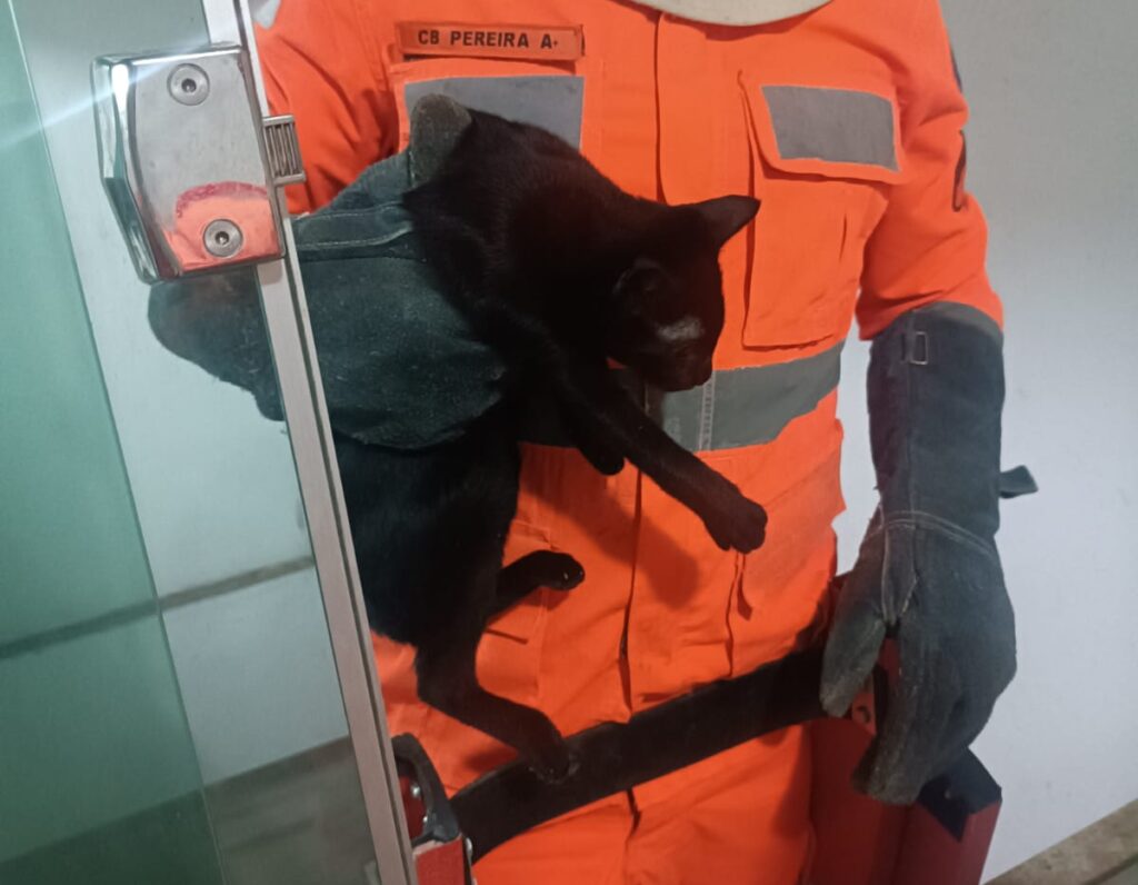 Após uma hora de trabalho e ancoragem pelo terraço, a felina Cristal foi retirada e devolvida aos donos