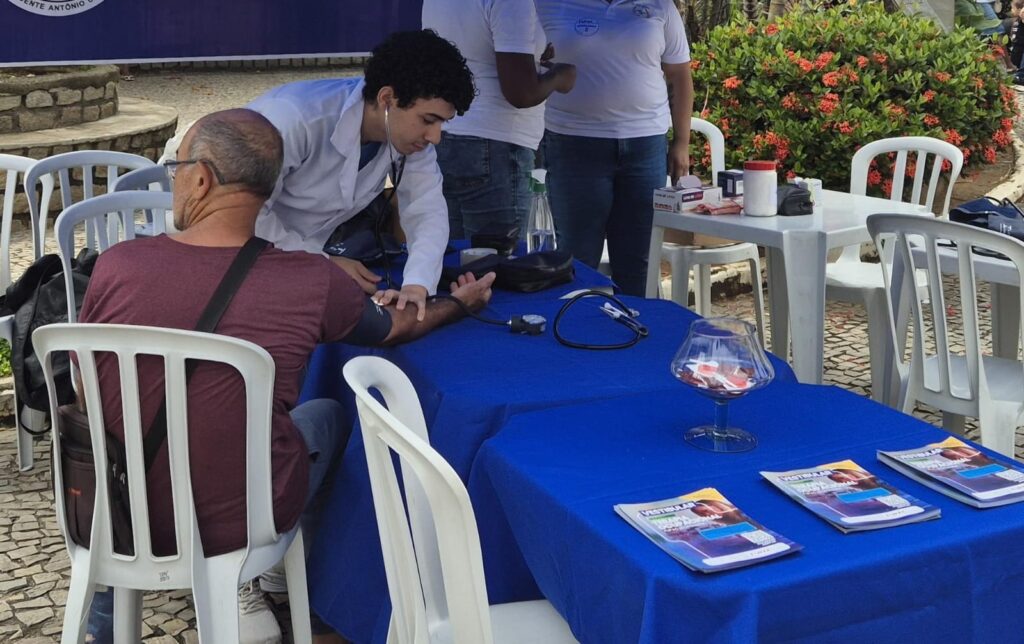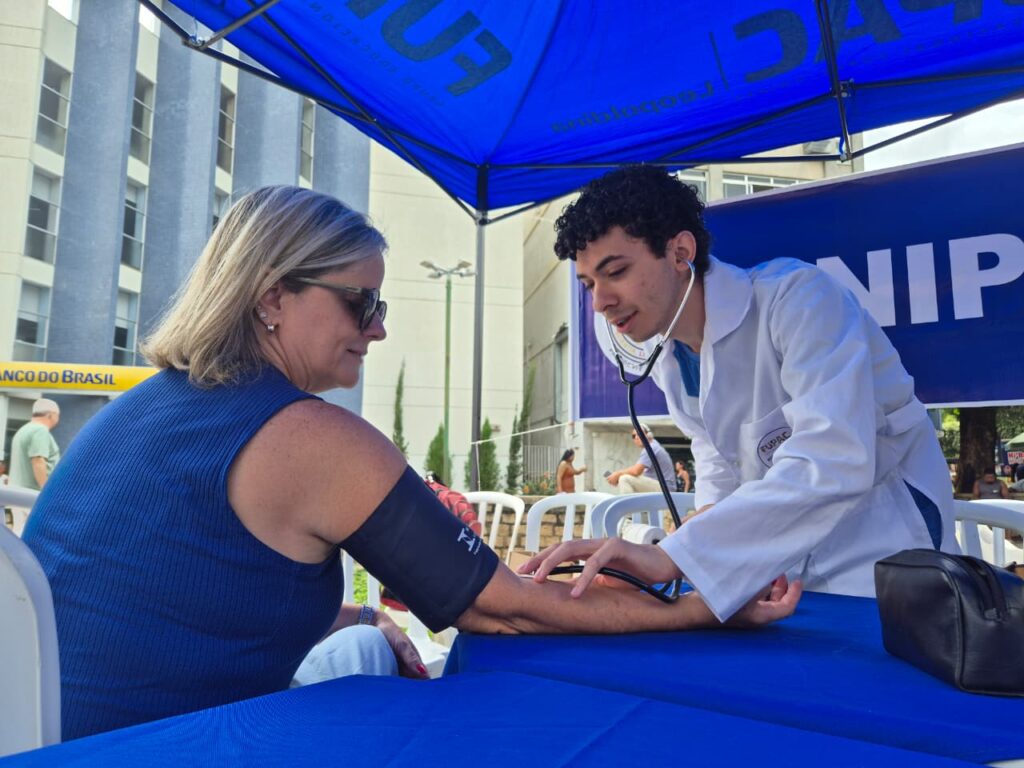 Atendimentos de aferição de pressão arterial e de glicemia capilar estão sendo realizados na praça, no Centro da cidade