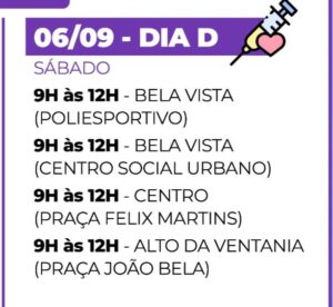 Neste sábado, haverá pontos de vacinação em quatro locais: no poliesportivo e no centro social urbano do Bela Vista; na Praça Félix Martins, no Centro e na Praça João Bela, Alto da Ventania. O horário de funcionamento será das 9h às 12h.